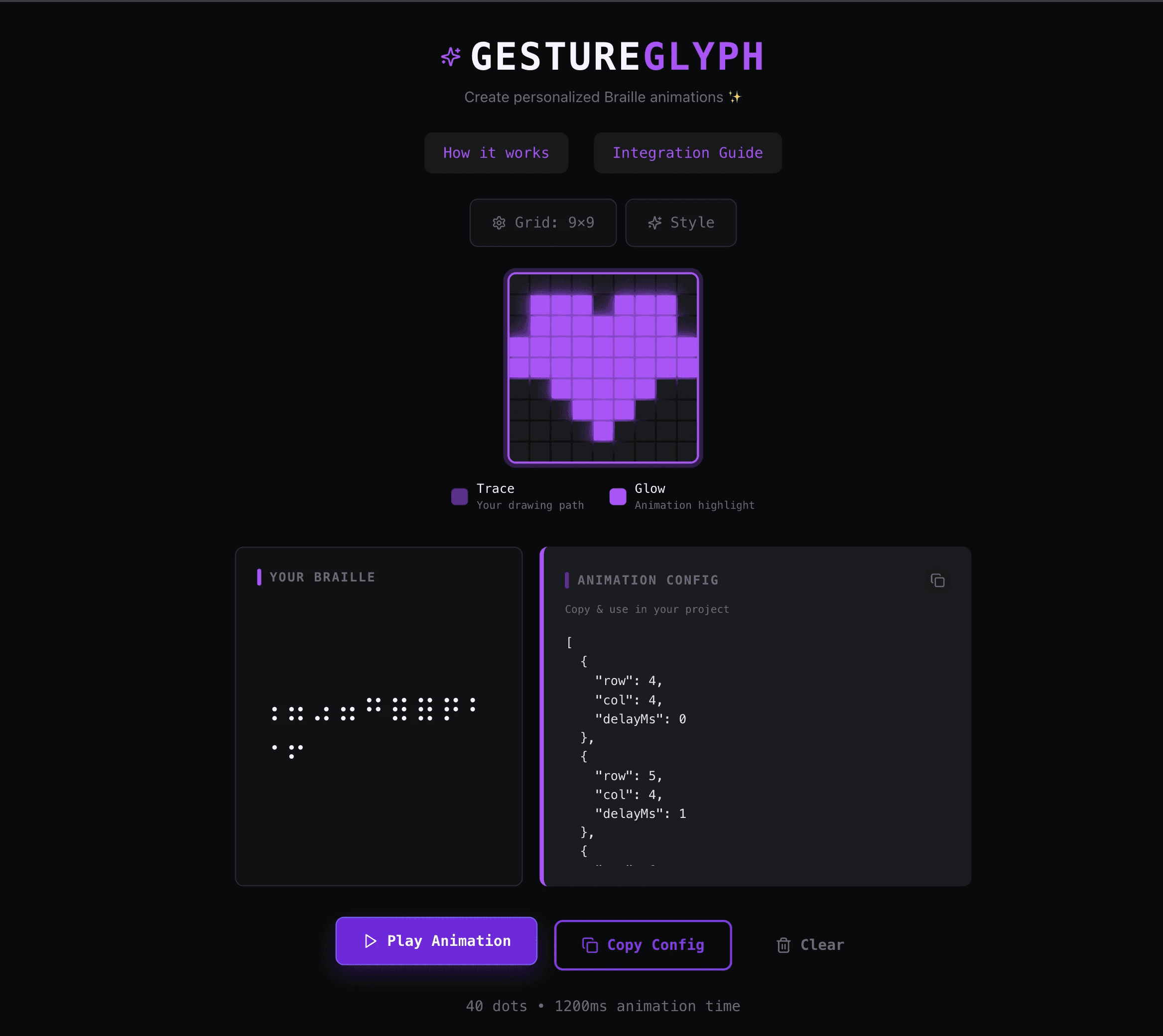 "Build a Braille animation creator called GestureGlyph. Users should be able to draw on a 9×9 grid canvas using mouse or touch. As they draw, the gestures should be converted to Braille Unicode characters in real time. The app should be able to play back the drawing as an animated Braille sequence. Users should be able to customise the animation style — colors, glow intensity, and themes. At the end, they should be able to copy a JSON config of the animation to embed it in any web project. The interface should be dark-themed and minimal."